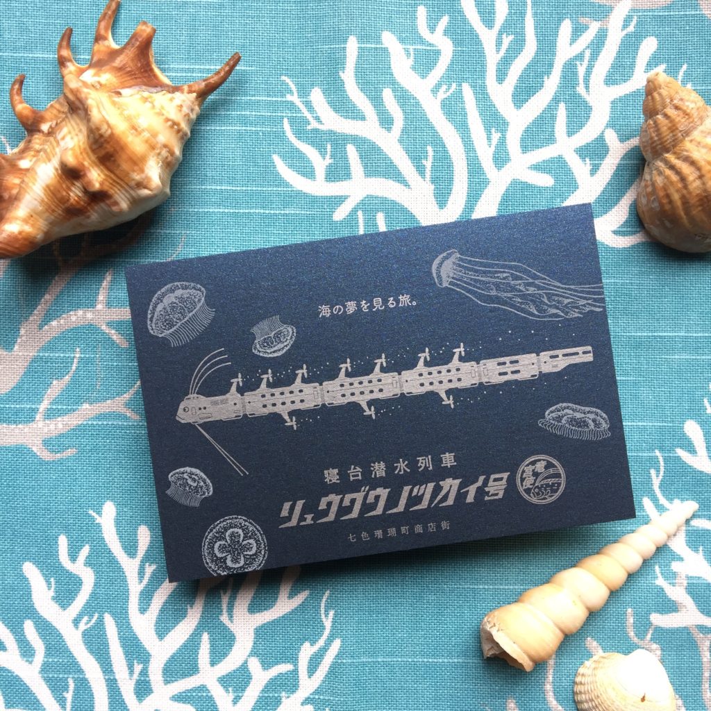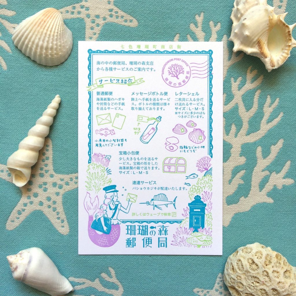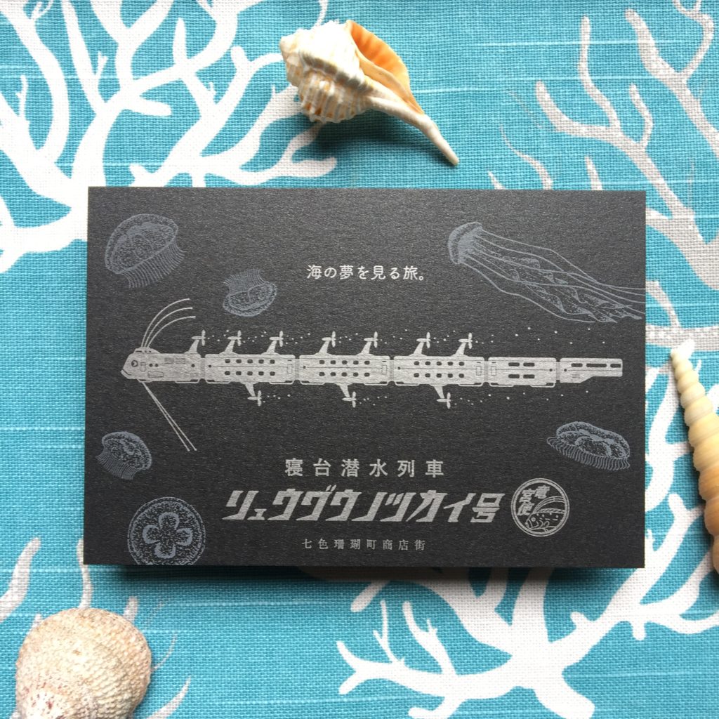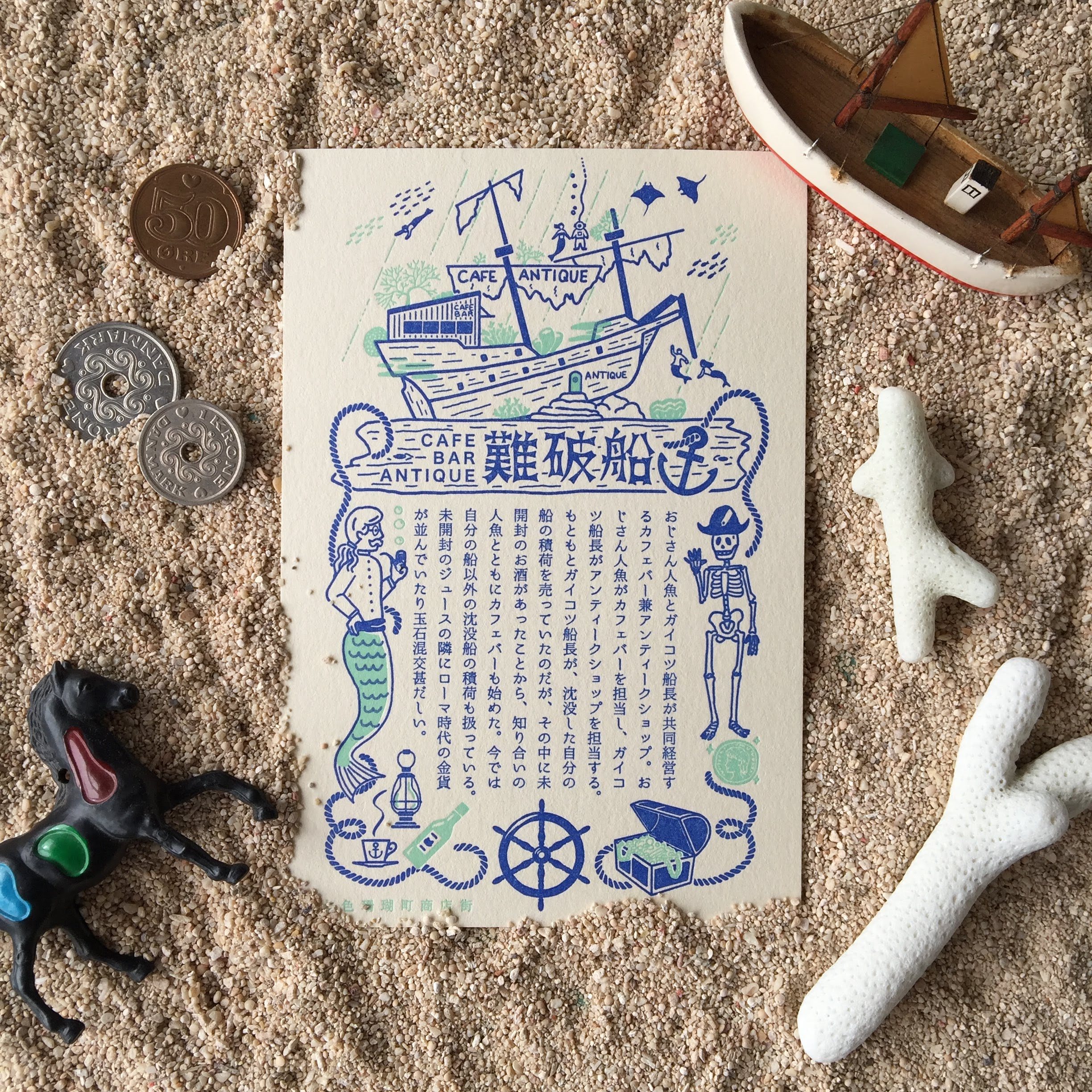 カメタクシーを降りた私は、なじみの店へ向かった。商店街の端にあるそのカフェは年代物の難破船をリフォームしたものだった。水面から差し込む光が、忘れかけていた冒険心をくすぐる。店内の客はまばらだった。私が座った席の斜向いでは、飲み物を片手に人魚の女の子が手紙を書いている。陸用郵便のボトルが置かれているのを見ると、どうやら、陸上の想い人にでも手紙を書いているのだろうか。さしずめ現代版人魚姫かな、なんてことを考えていたらマスターがしっぽをひらめかせつつ注文を取りに来た。